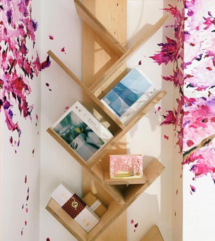 Mitopia以原本就安排在中間的木製層架爲樹幹去構想畫面,牆面兩側延伸出春天櫻花樹盛開的場景,因牆面本身有前後深度差,彩繪可依照著本身條件去做變化,不對稱性的彩繪設計從店內或店外的每個角度觀看,都能有不同的感受,想像櫻花落下的生動畫面,讓顧客在那邊區塊看書時,彷彿是坐在櫻花樹下。有空過去賞花看書喝咖啡囉!