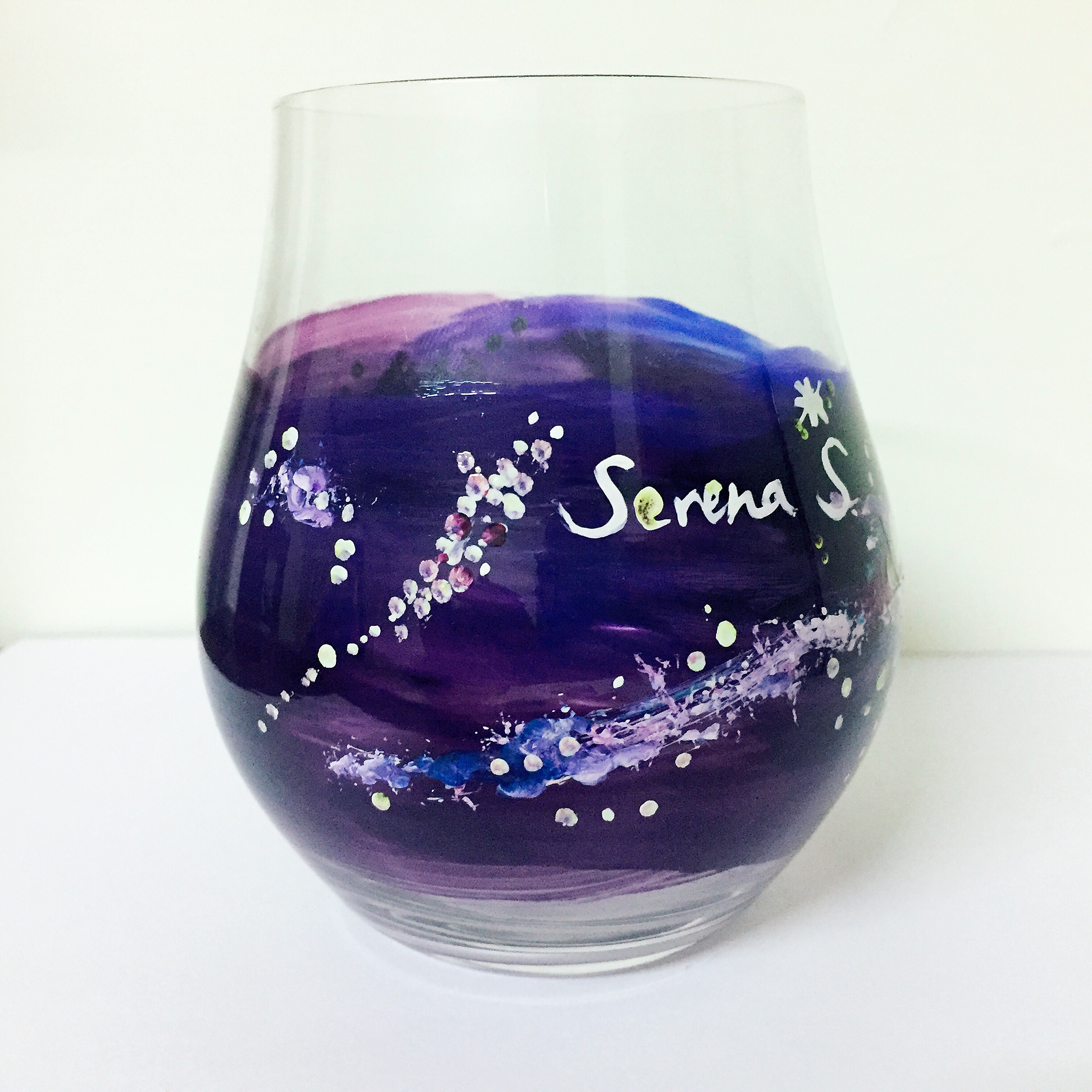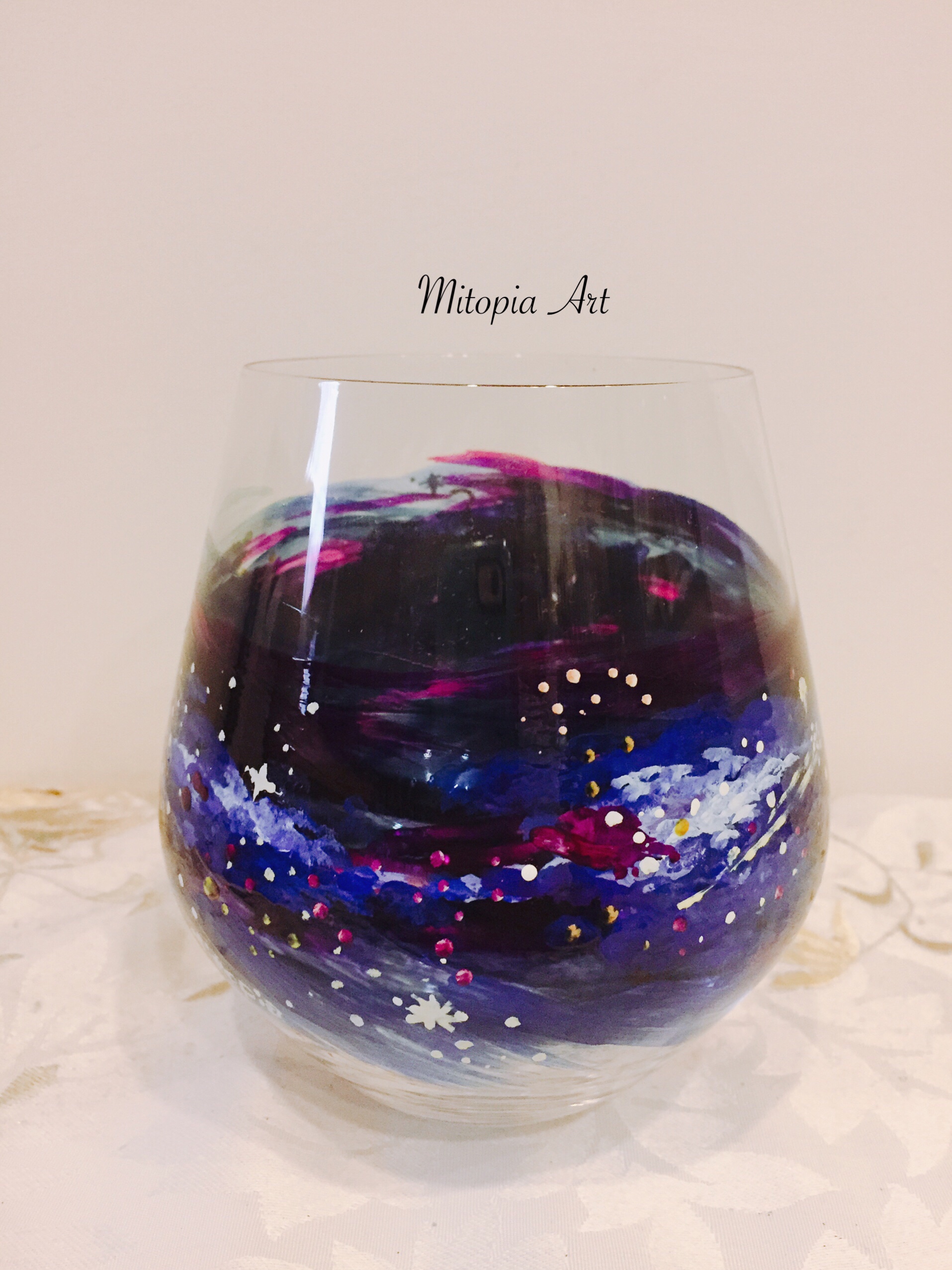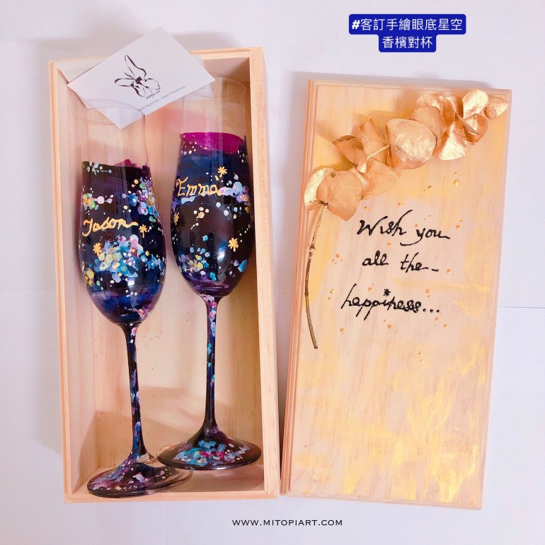 Mitopia客製手繪酒杯以『星空』為主題,並寫上每位貴賓的姓名,代表浩瀚宇宙中最亮的一顆星,獨一無二的手繪設計,讓貴賓覺得備受尊榮!